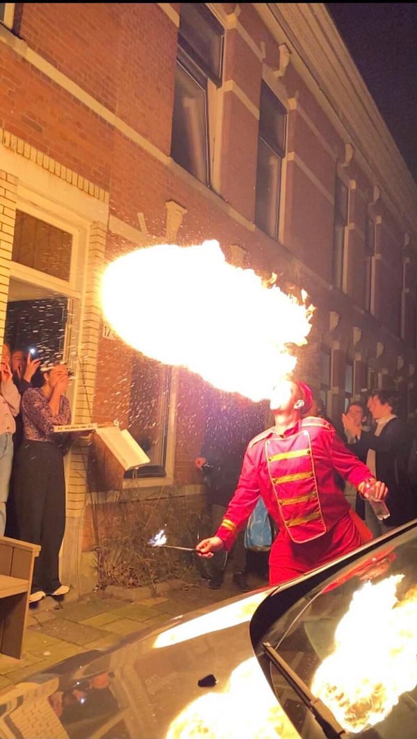 Een vuurspuwer zorgt voor die ‘wow’-factor waar iedereen het nog lang over heeft.